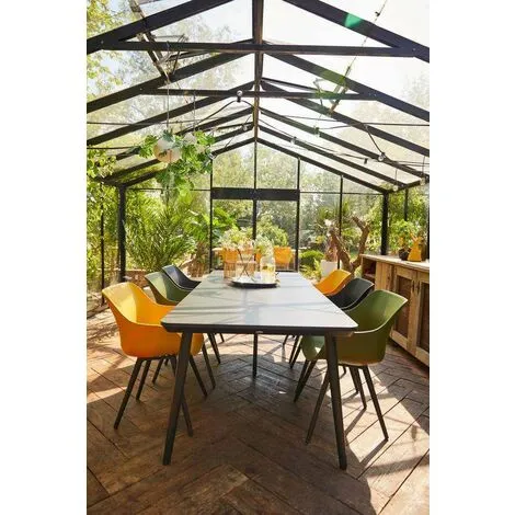 Découvrez notre table de jardin SOPHIE STUDIO avec plateau HPL (stratifié haute pression) et base en aluminium. Elégante avec ses pieds coniques, cette table est également très solide.